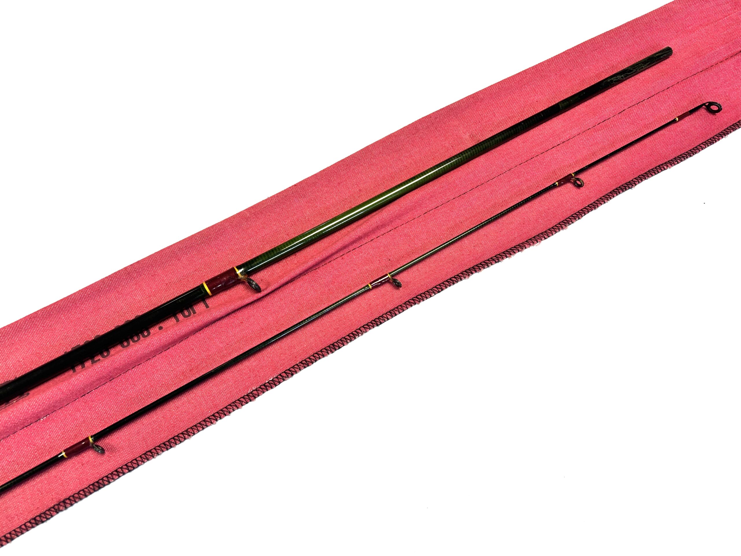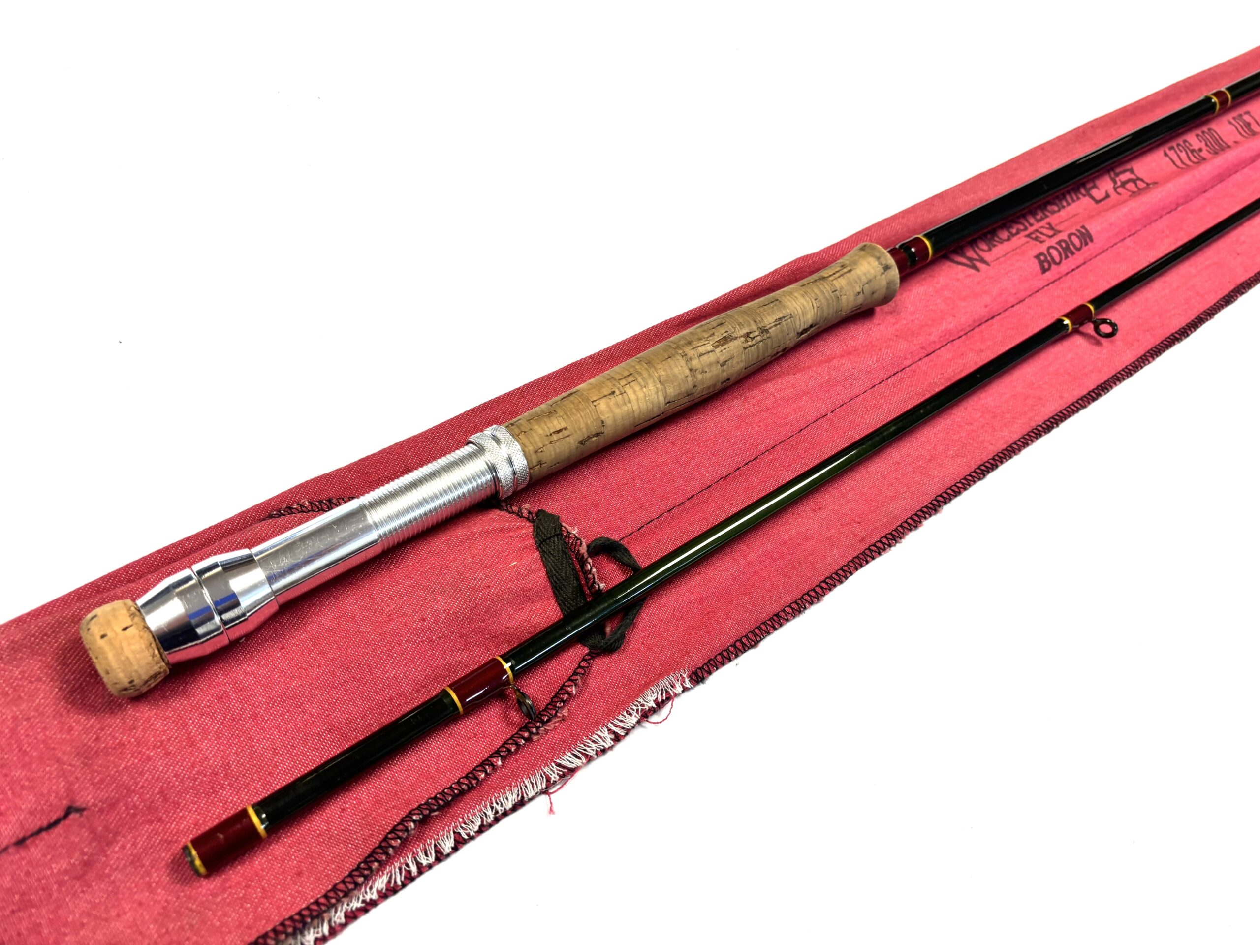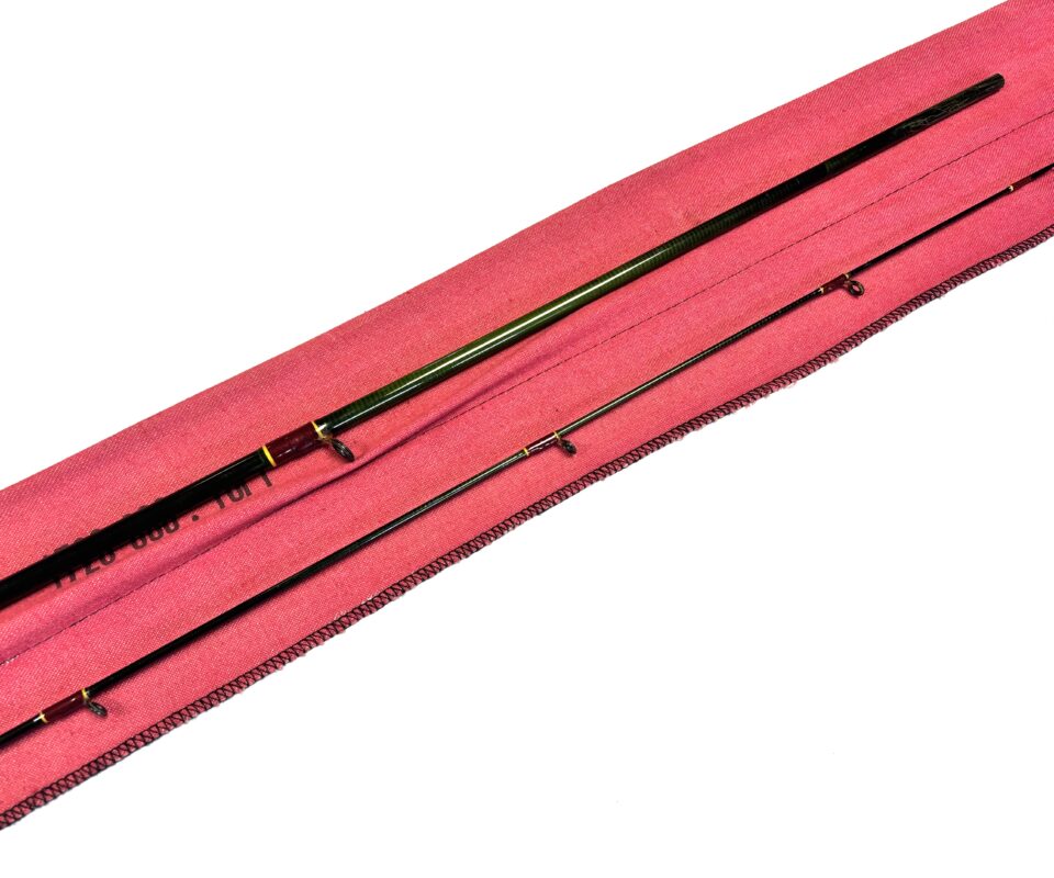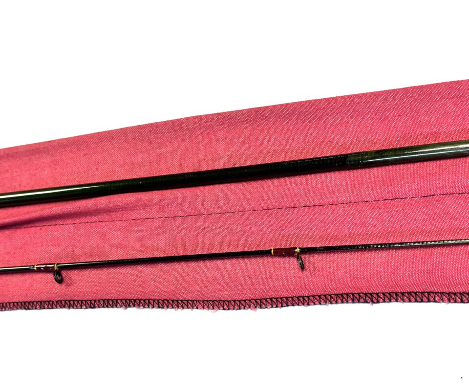 Two-piece rod with burgundy wraps, cork handle and original cloth bag.