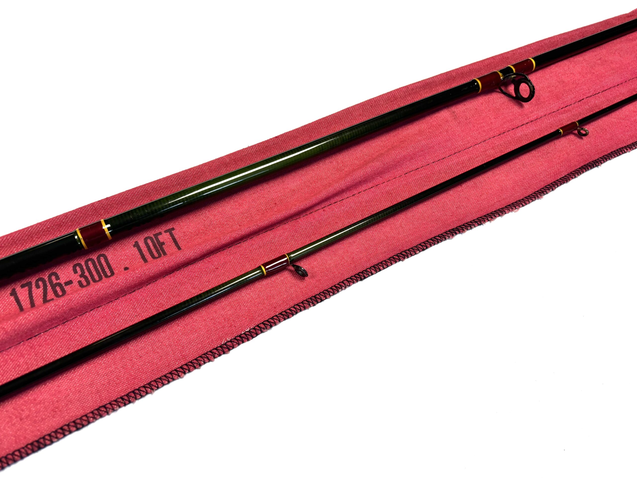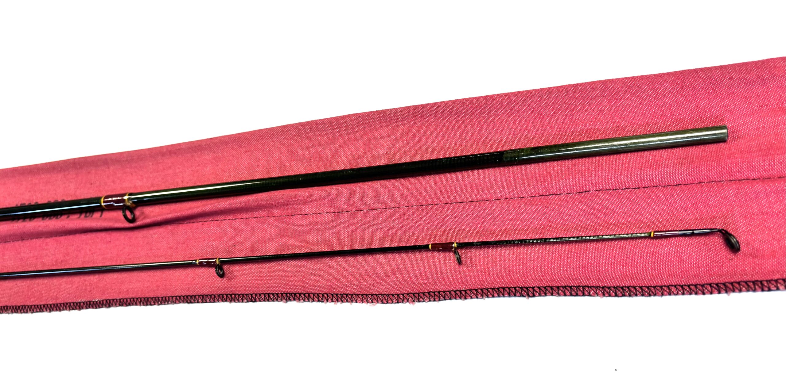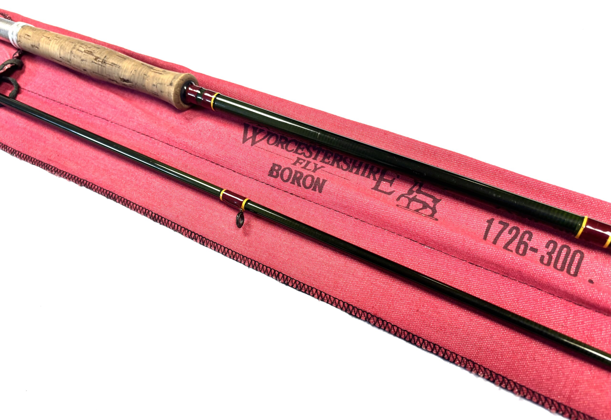 Two-piece rod with burgundy wraps, cork handle and original cloth bag.