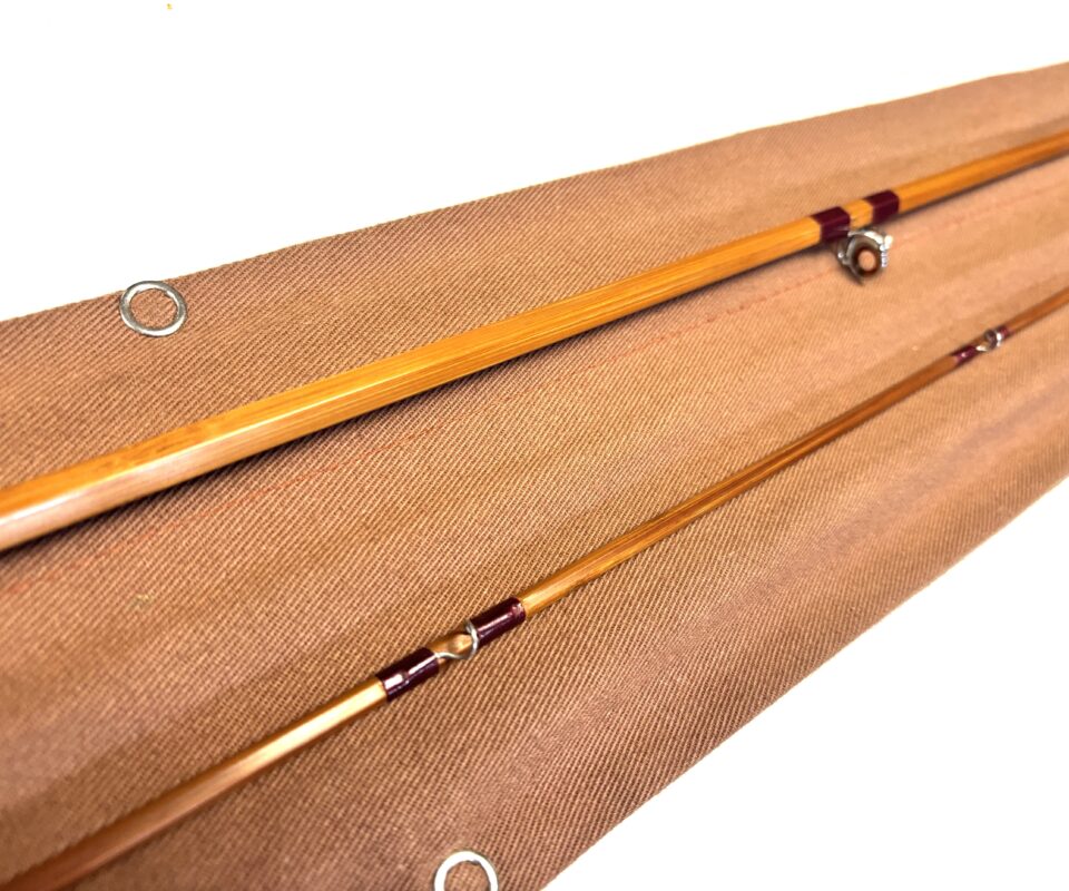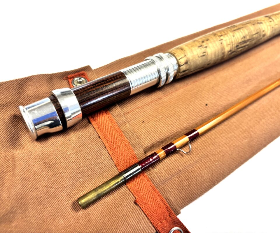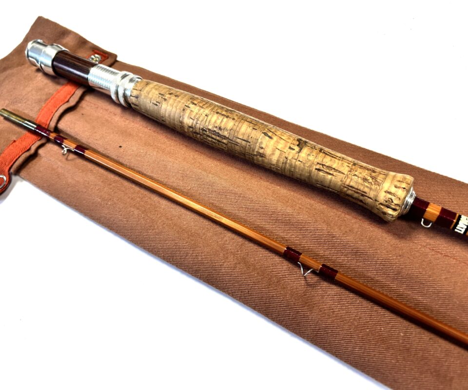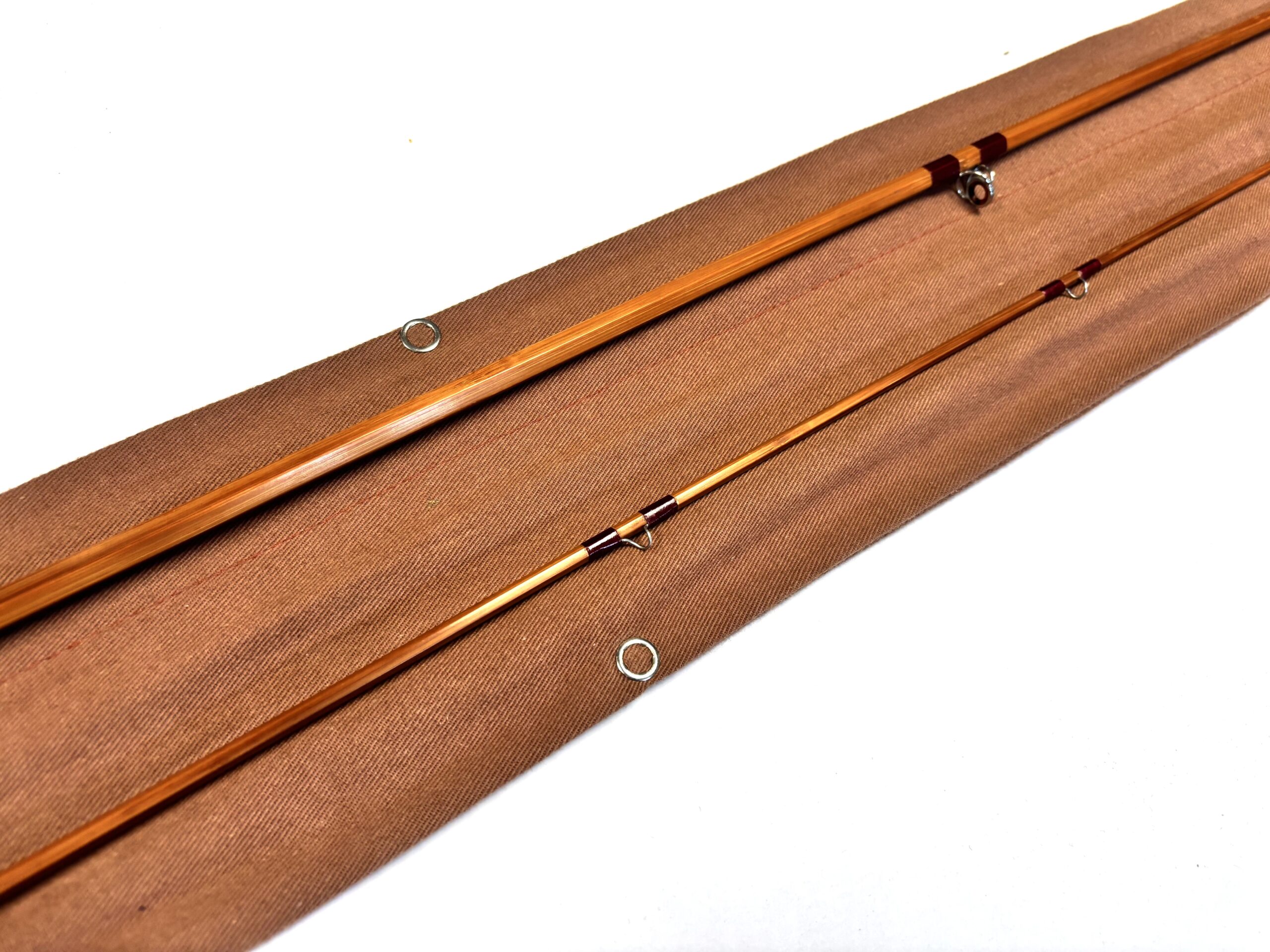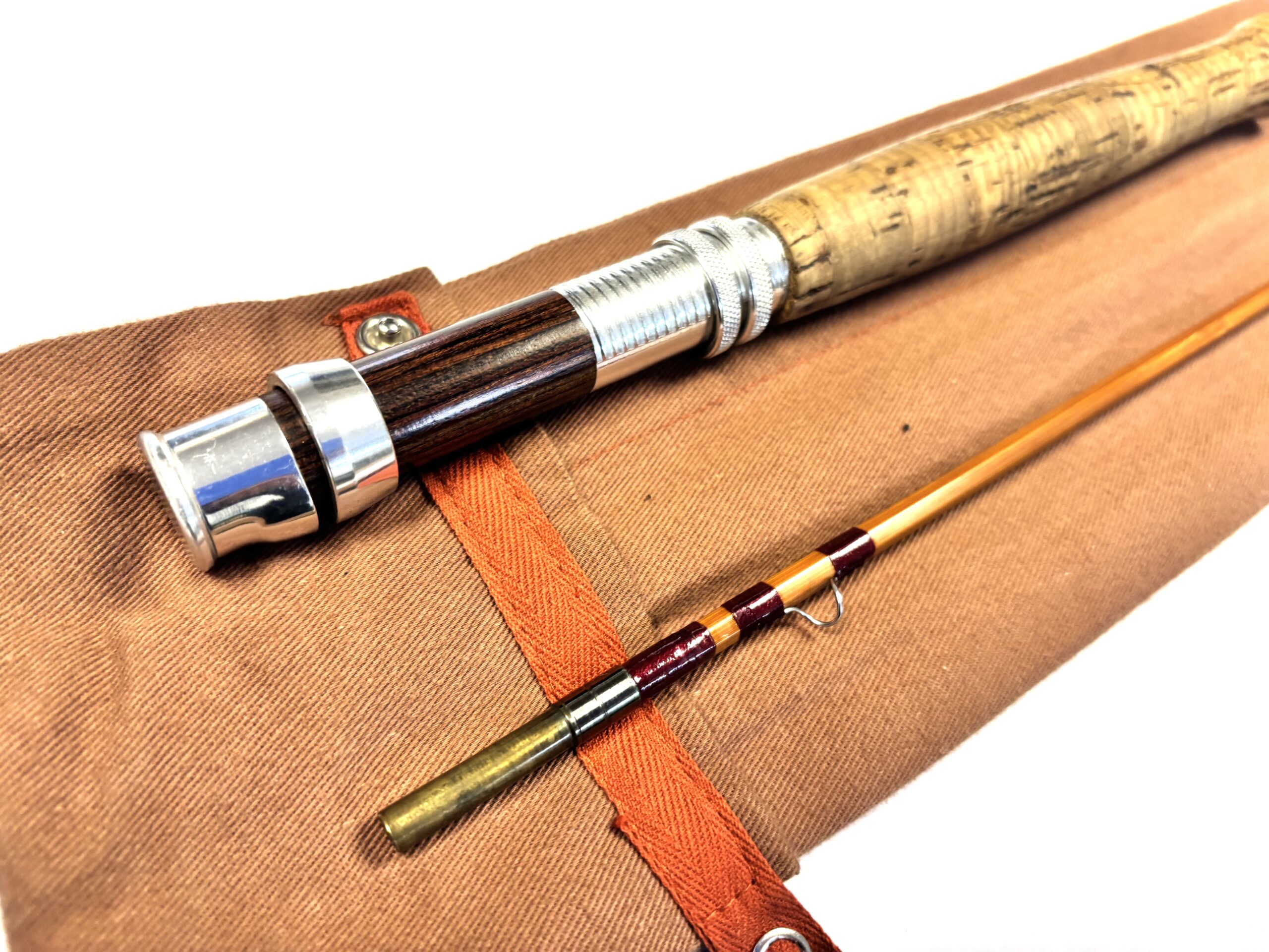 Thomas Turner Opinion: Just arrived, this rarely seen Sharpes “Scottie” Featherweight two-piece trout fly rod measures 7’6” with a #5 line rating. The rod is full length with a nice, tight suction ferrule joint, and the cane remains clean throughout. A very good, usable example supplied in a dark brown cloth rod bag.