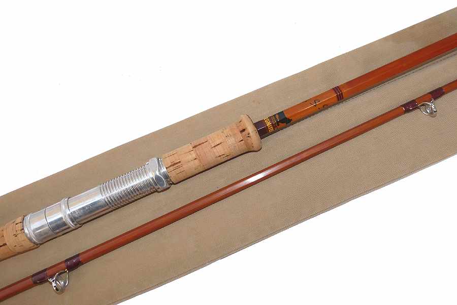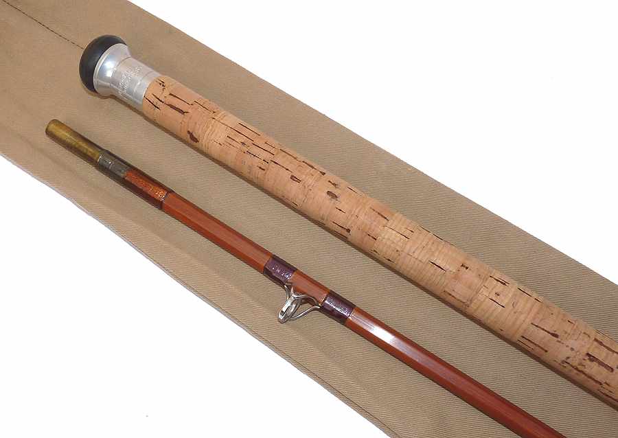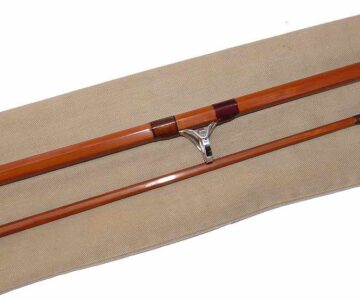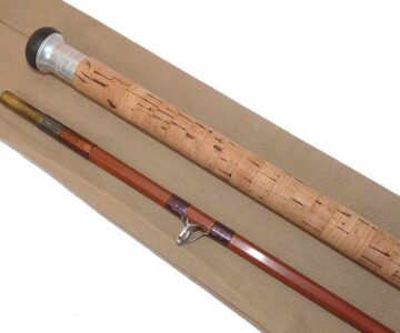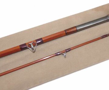 TT opinion: This is a Sharpes of Aberdeen Scottie Spinning rod, 9’3”, 2-piece impregnated split cane. Burgundy whipped full bridge guides, copper under whipped butt rings, bronze ferrule, wood stopper. 27” cork handle, screw alloy reel fitting and butt cap stamped with makers details and rod no 39-36 Stunning rod built for salmon spinning but equally at home with carp or pike fishing. Comes in maker’s original cloth bag.