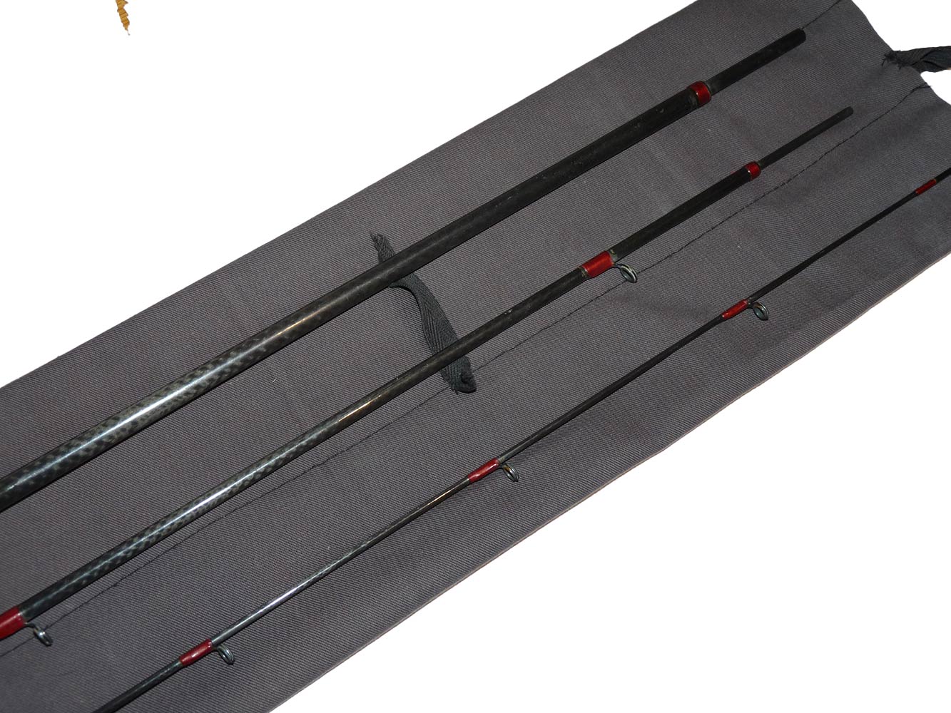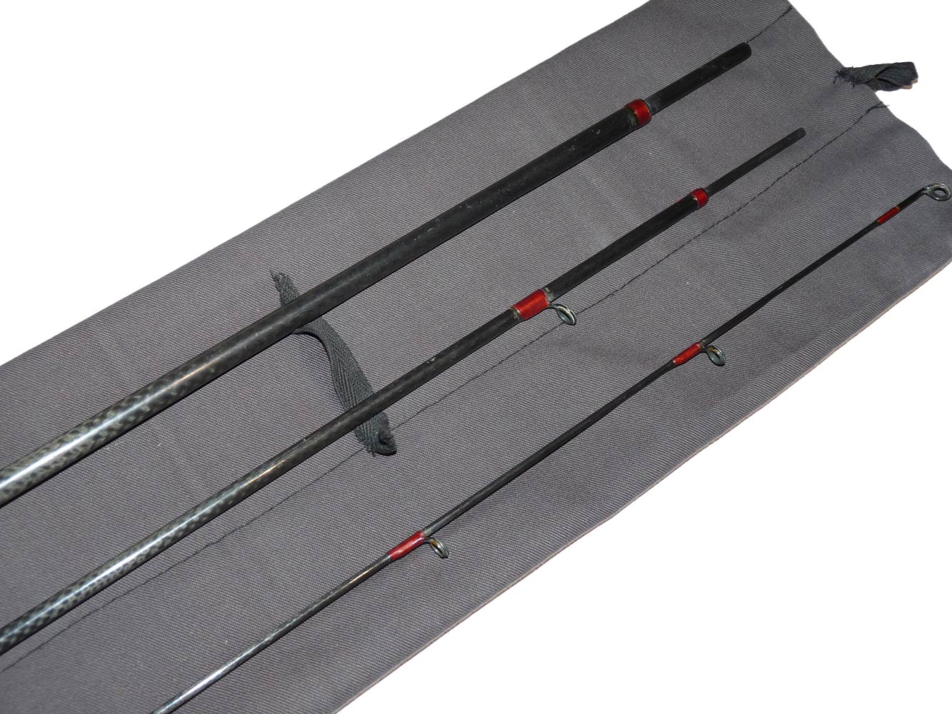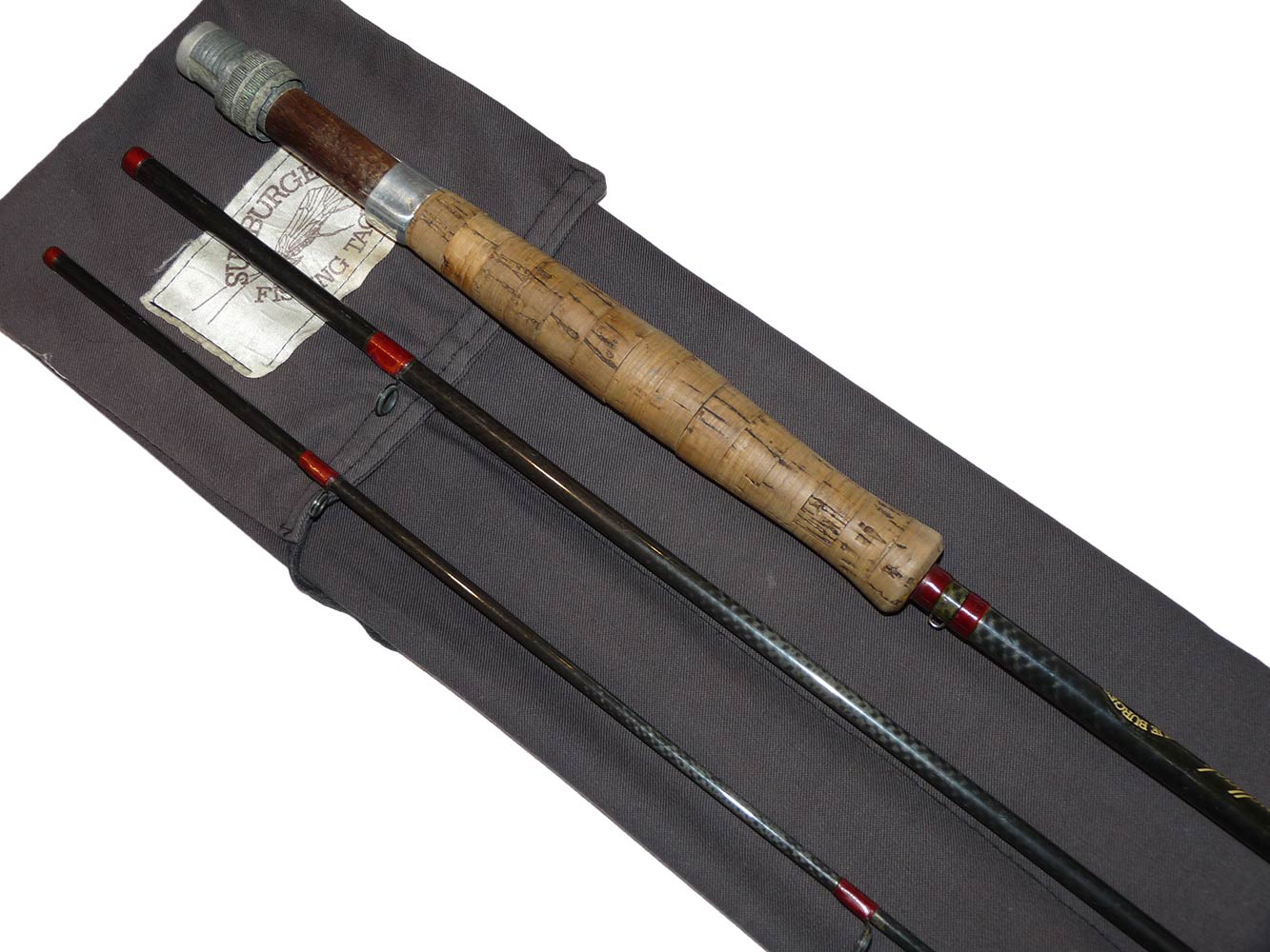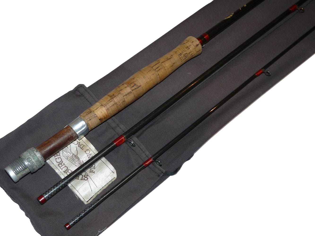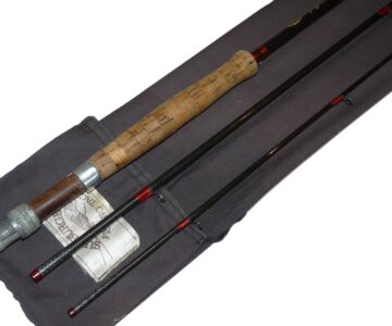 A very good usable all through action trout fly rod with shaped cork handle and alloy reel fittings. Whipped in red with gold tips. A nice straight rod ready to fish in its original cloth rod back.