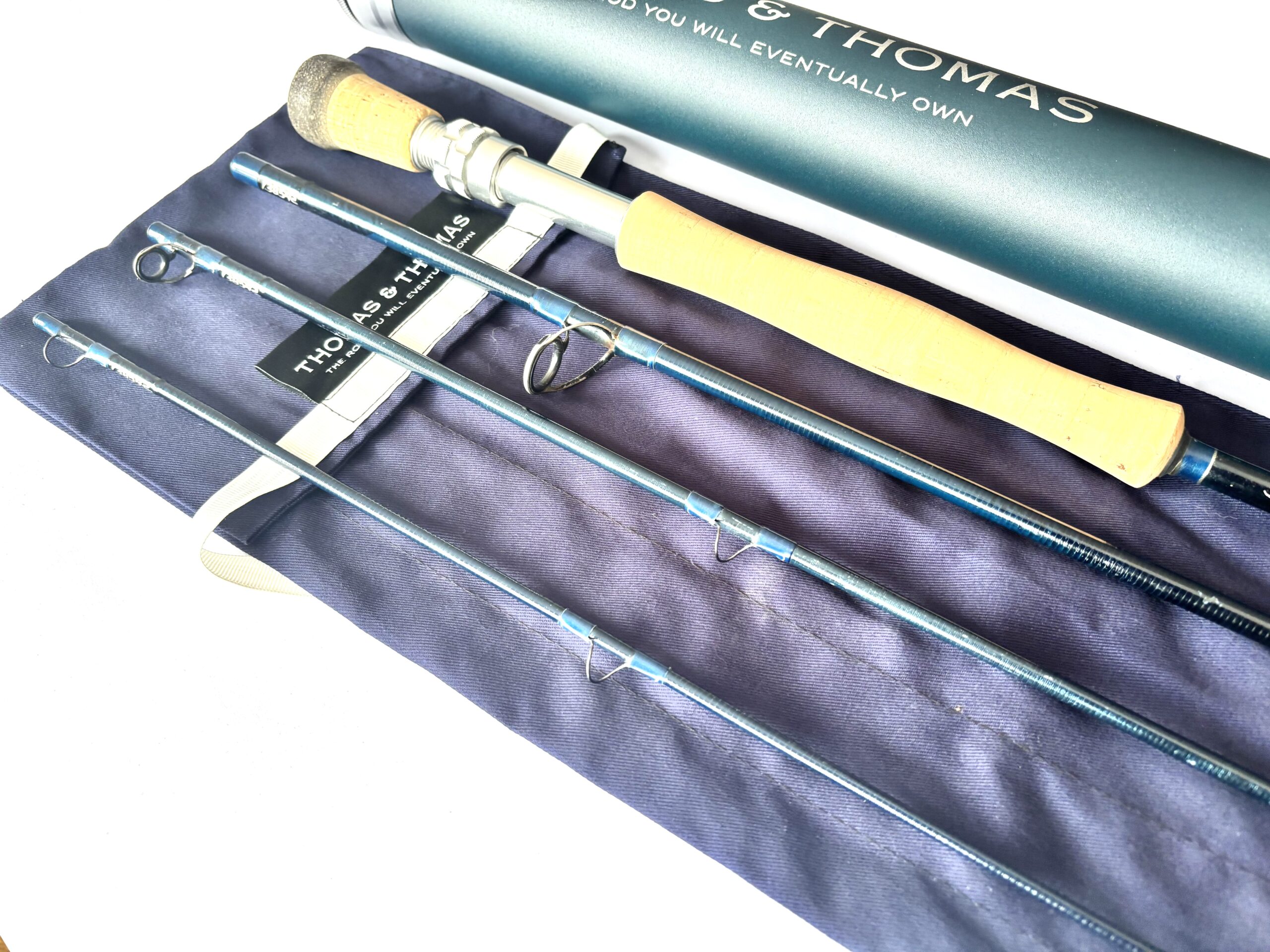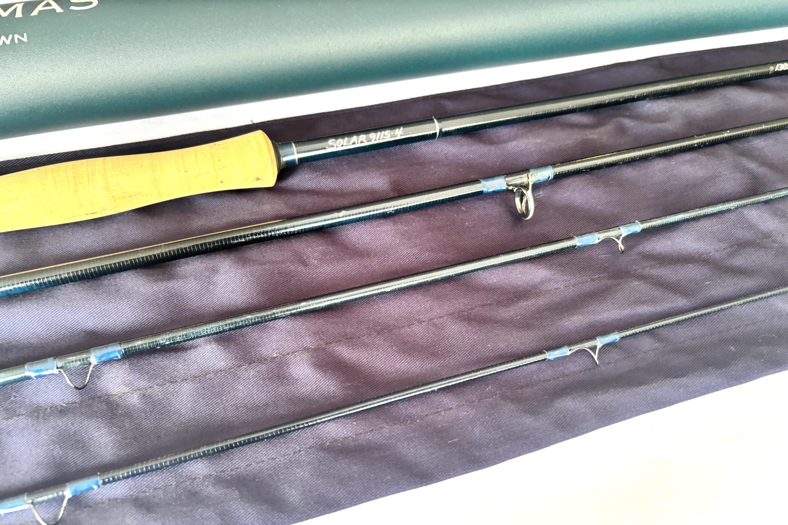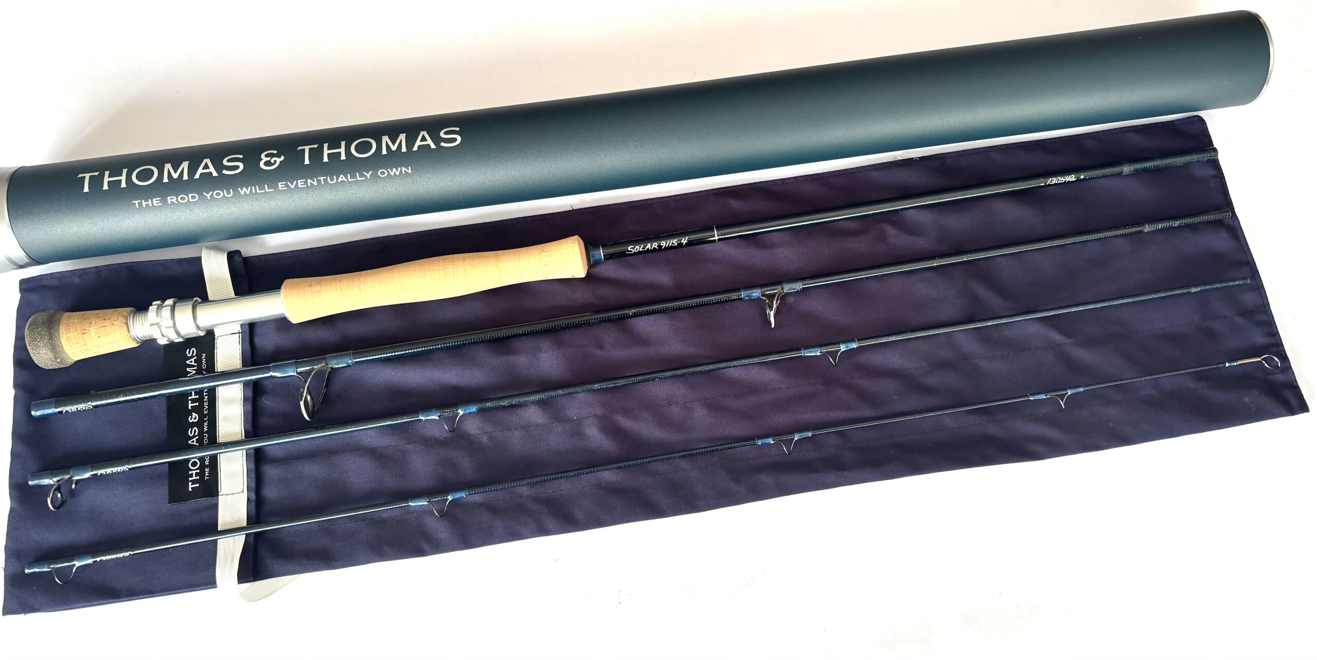 Maker: Thomas & Thomas; Model: Solar; Year: 2000s; Condition: Fine; Length: 9’; Line Rating: #11; Country: USA; Ideal Use: Trout/Saltwater Fly Fishing; TT Opinion: As part of a large haul of T & T fly rods direct from Thomas & Thomas in the US this fine four piece carbon fly rod with a line rating of #11 features a smooth cork handle, lined alloy guides, blue wraps and comes complete with original rod bag and outer tube.