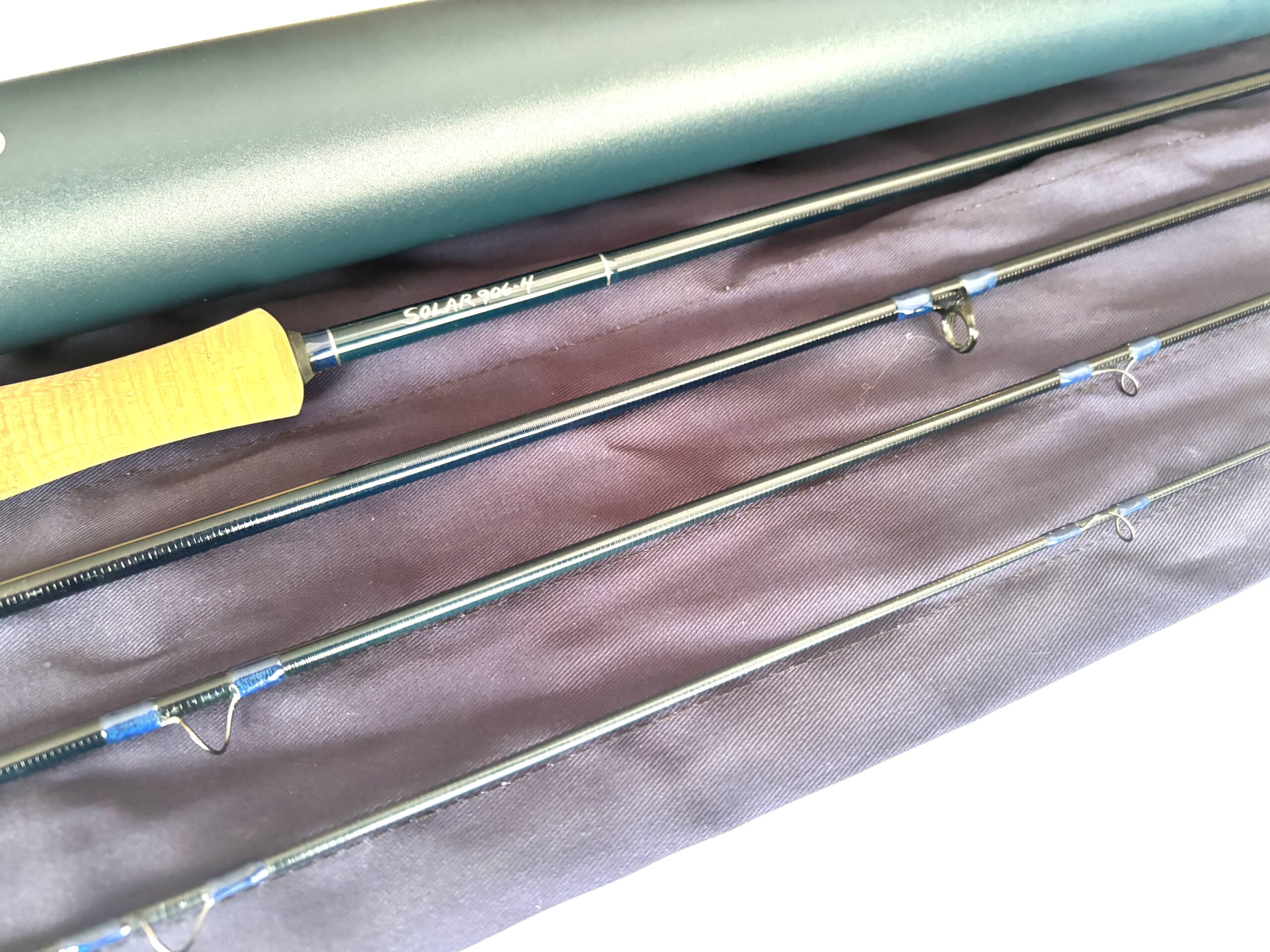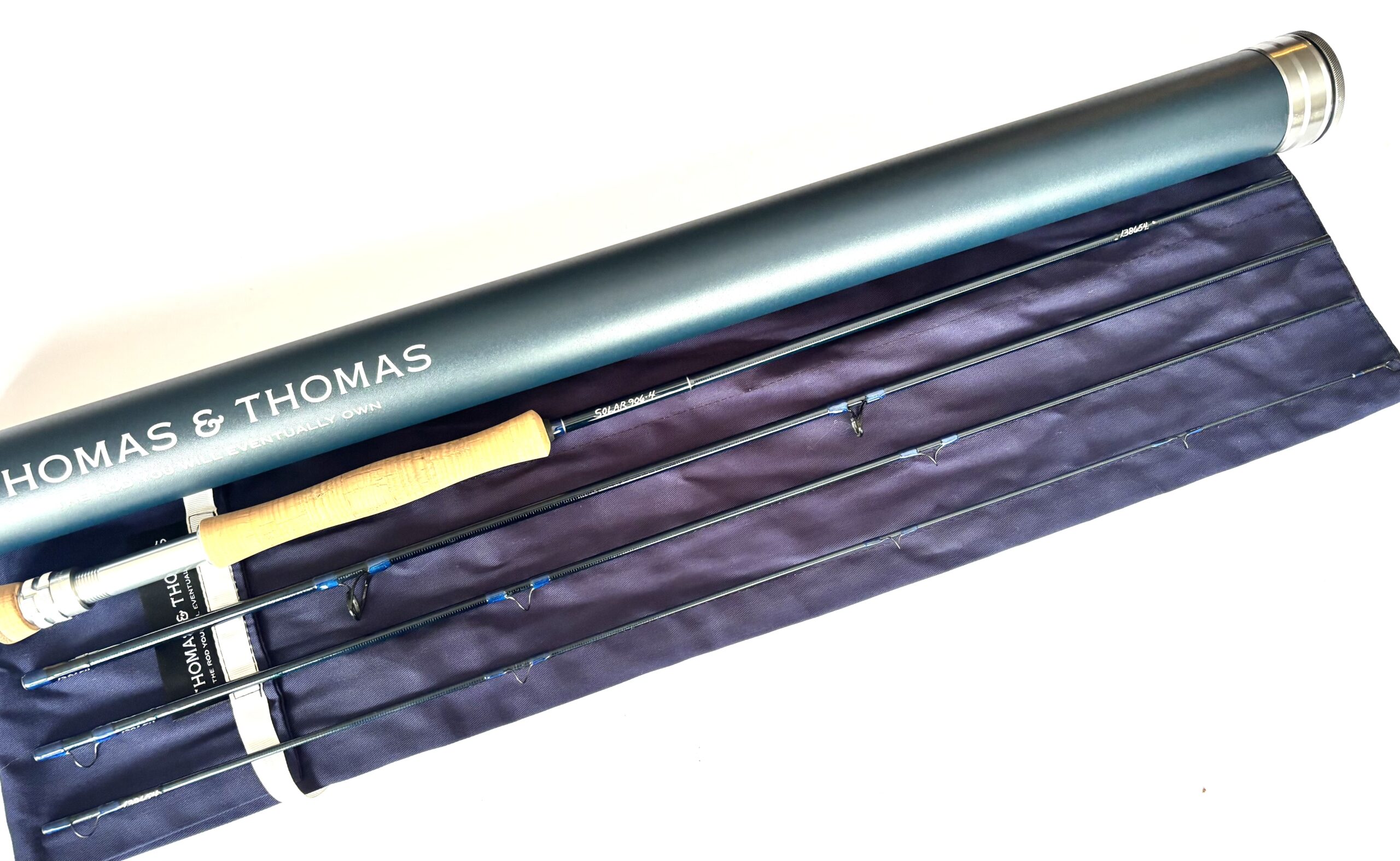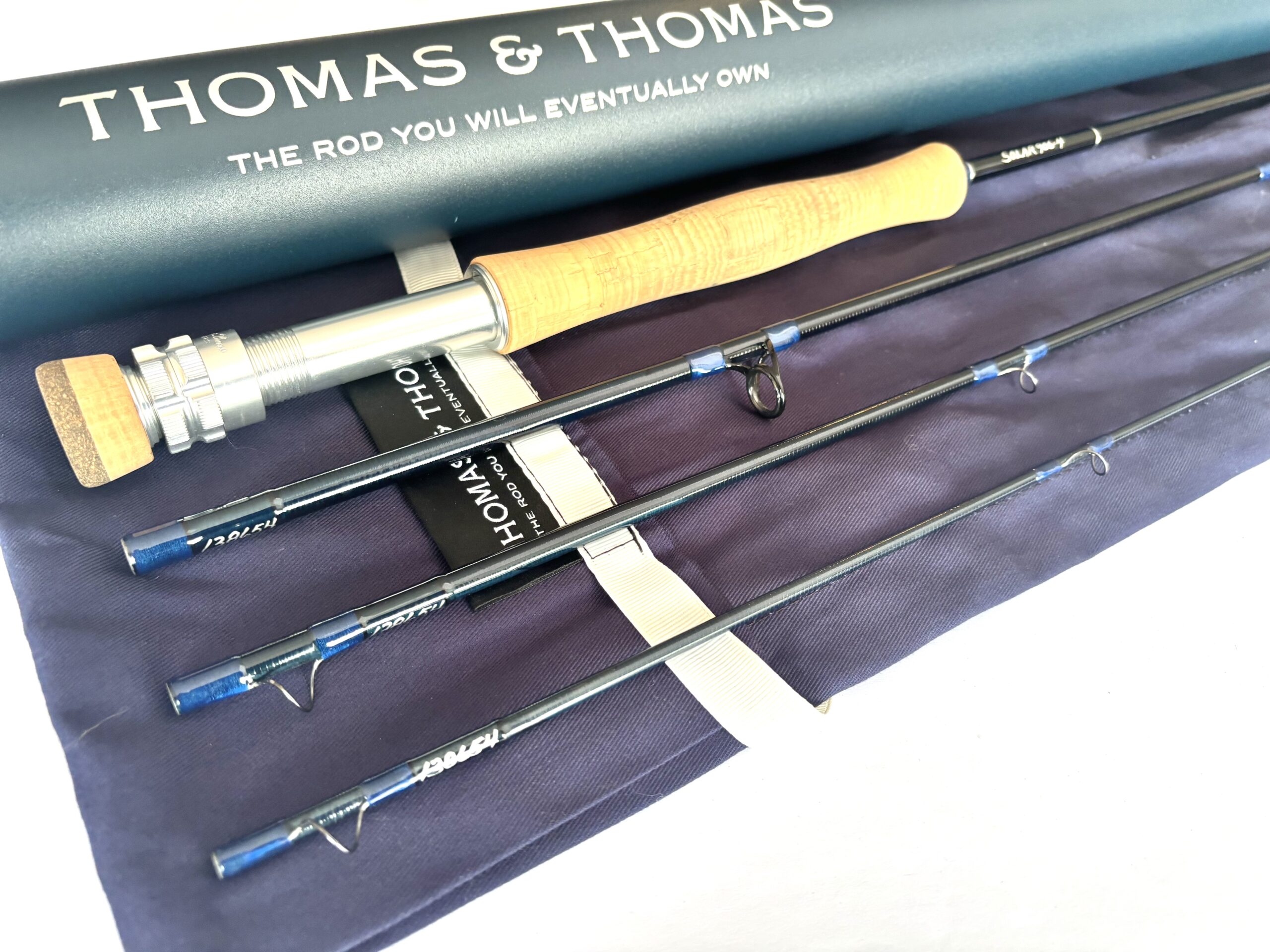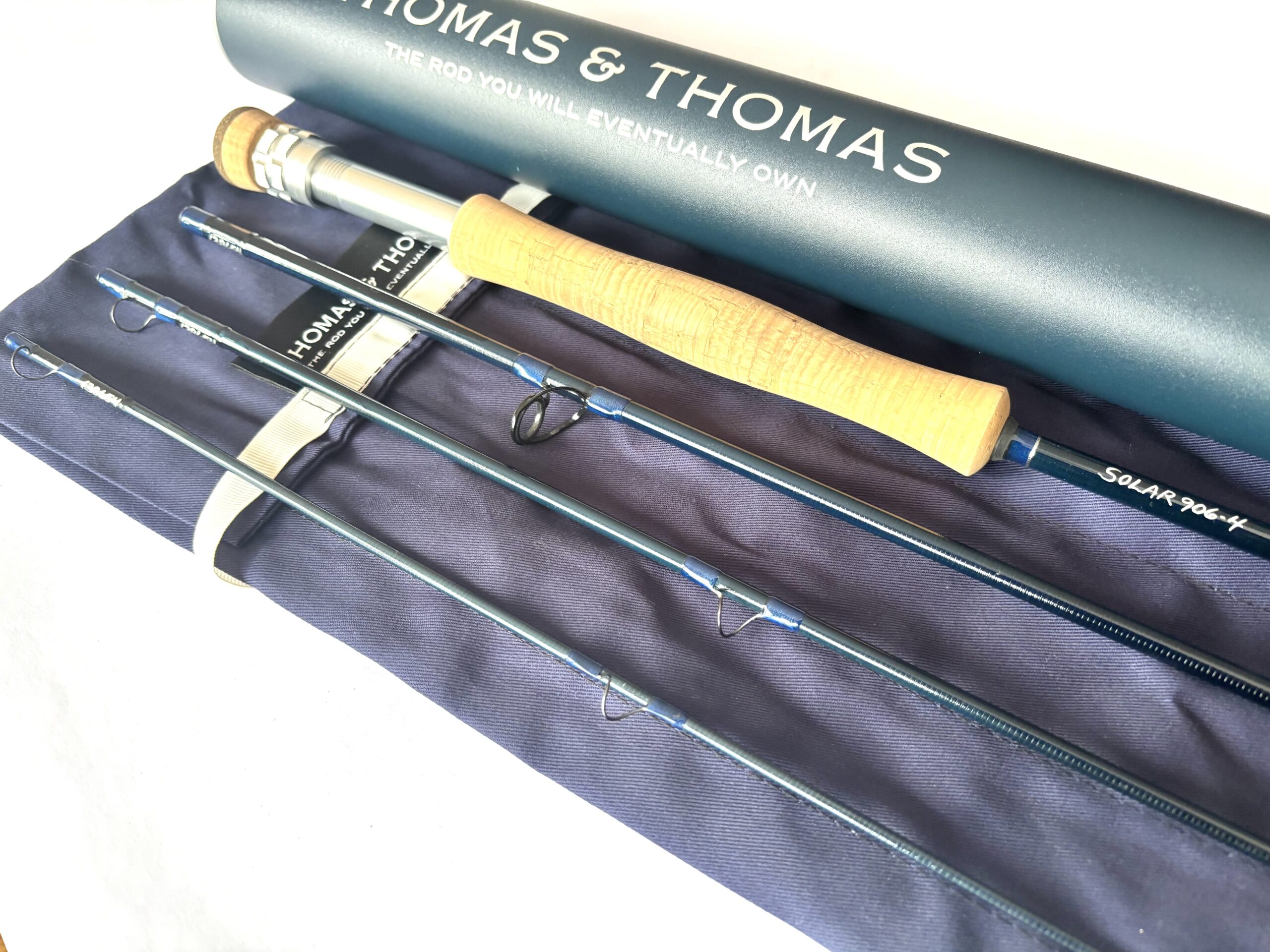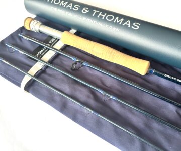 Maker: Thomas & Thomas; Model: Solar; Year: 2000s; Condition: Fine; Length: 9’; Line Rating: #6; Country: USA; Ideal Use: Trout/Saltwater Fly Fishing; TT Opinion: As part of a large haul of T & T fly rods direct from Thomas & Thomas in the US this fine four piece carbon fly rod with a line rating of #6 features a smooth cork handle, lined alloy guides, attractive dark blue wraps and comes complete with original rod bag and outer tube.