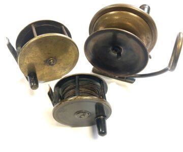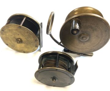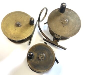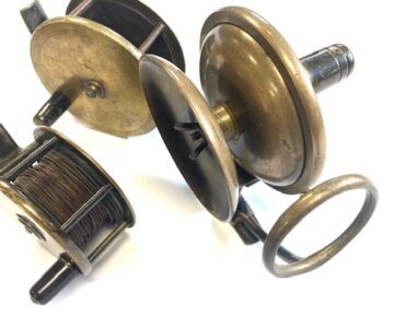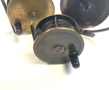 TT opinion: Here we have three nice Malloch reels with a 4.5″ side caster with ebonite handle, Gibbs Patent lever and fully working pivot. Next we have a 4″ brass platewind Malloch reel with shiny finish, ebonite handle and stamped with Malloch details to face plate. Nice strong constant check. Lastly we have 3.25″ Malloch all brass reel retaining nice original dark finish, black ebonite handle and constant check, stamped with makers details to front plate.