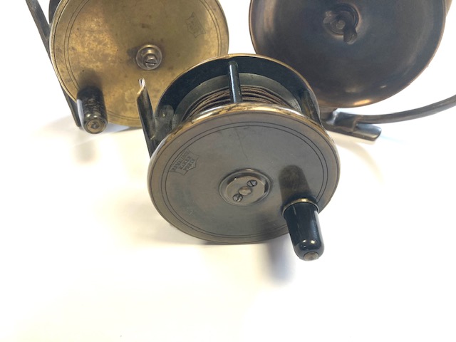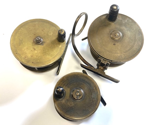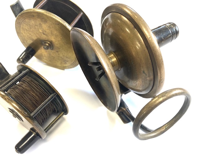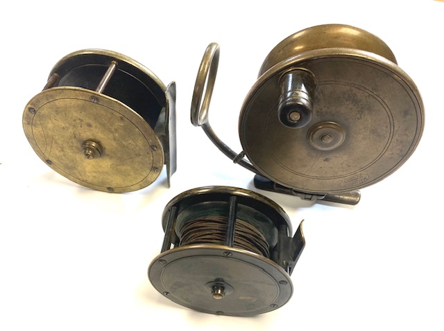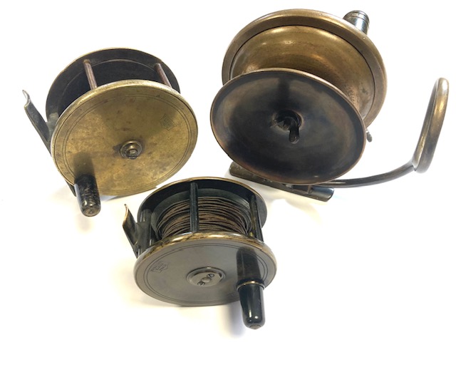 Malloch three vintage brass all brass reels, side caster, salmon reel etc