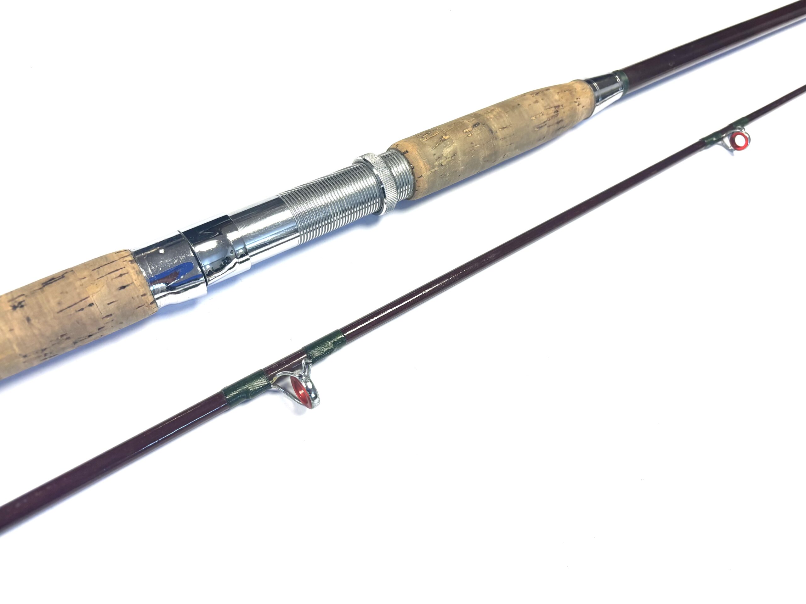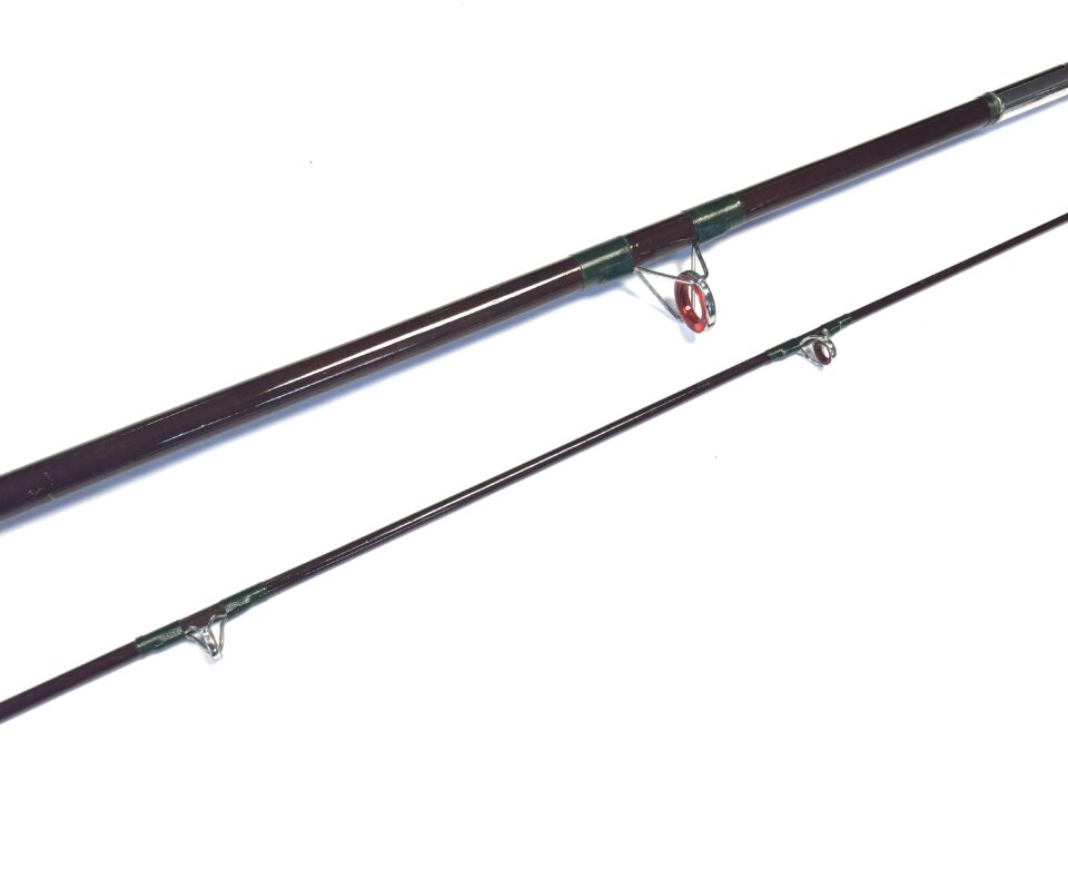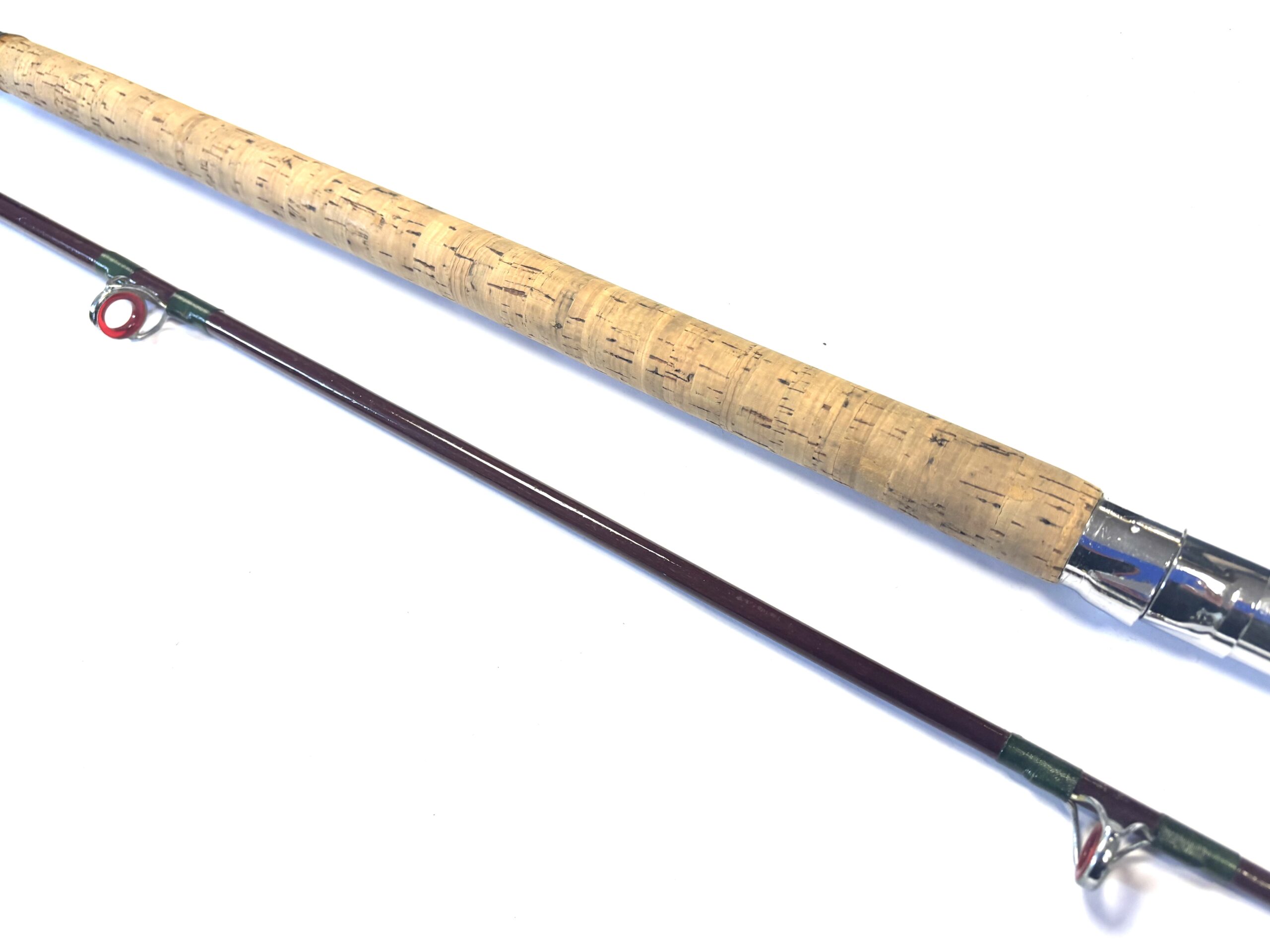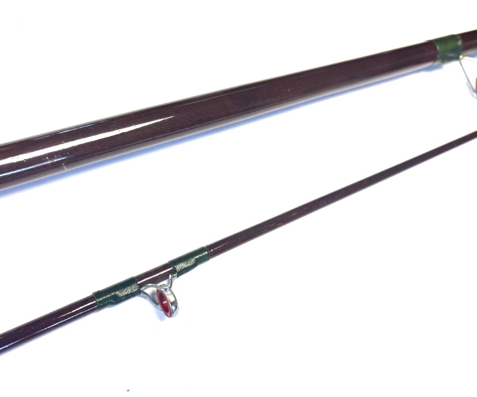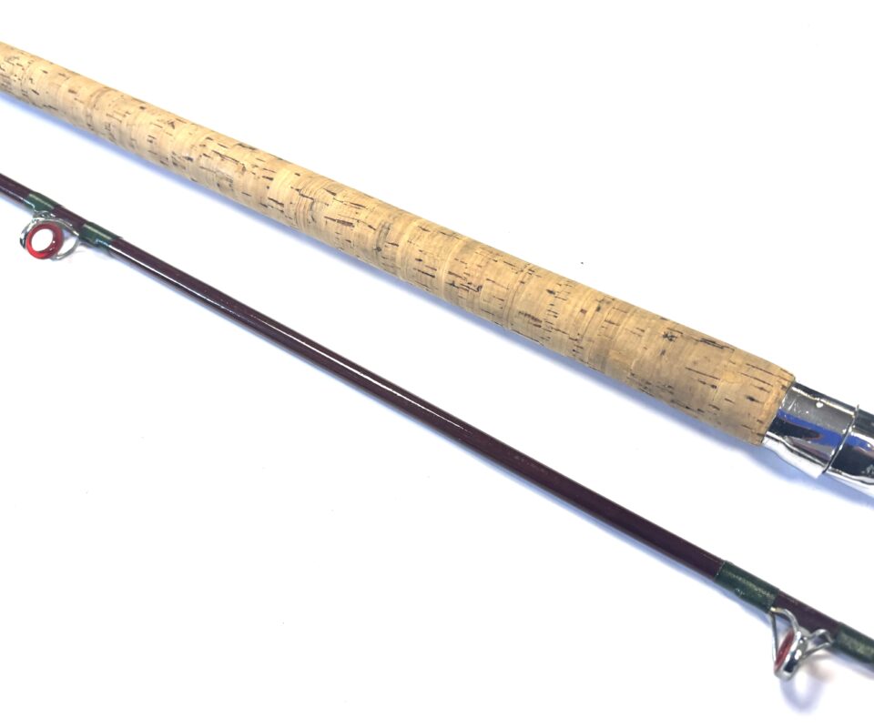 TT Opinion: A good example of a two-piece unidentified boat rod with lined guides, dark green wraps, smooth cork handle and polished alloy screw-in reel fittings. Supplied in beige bag.