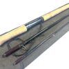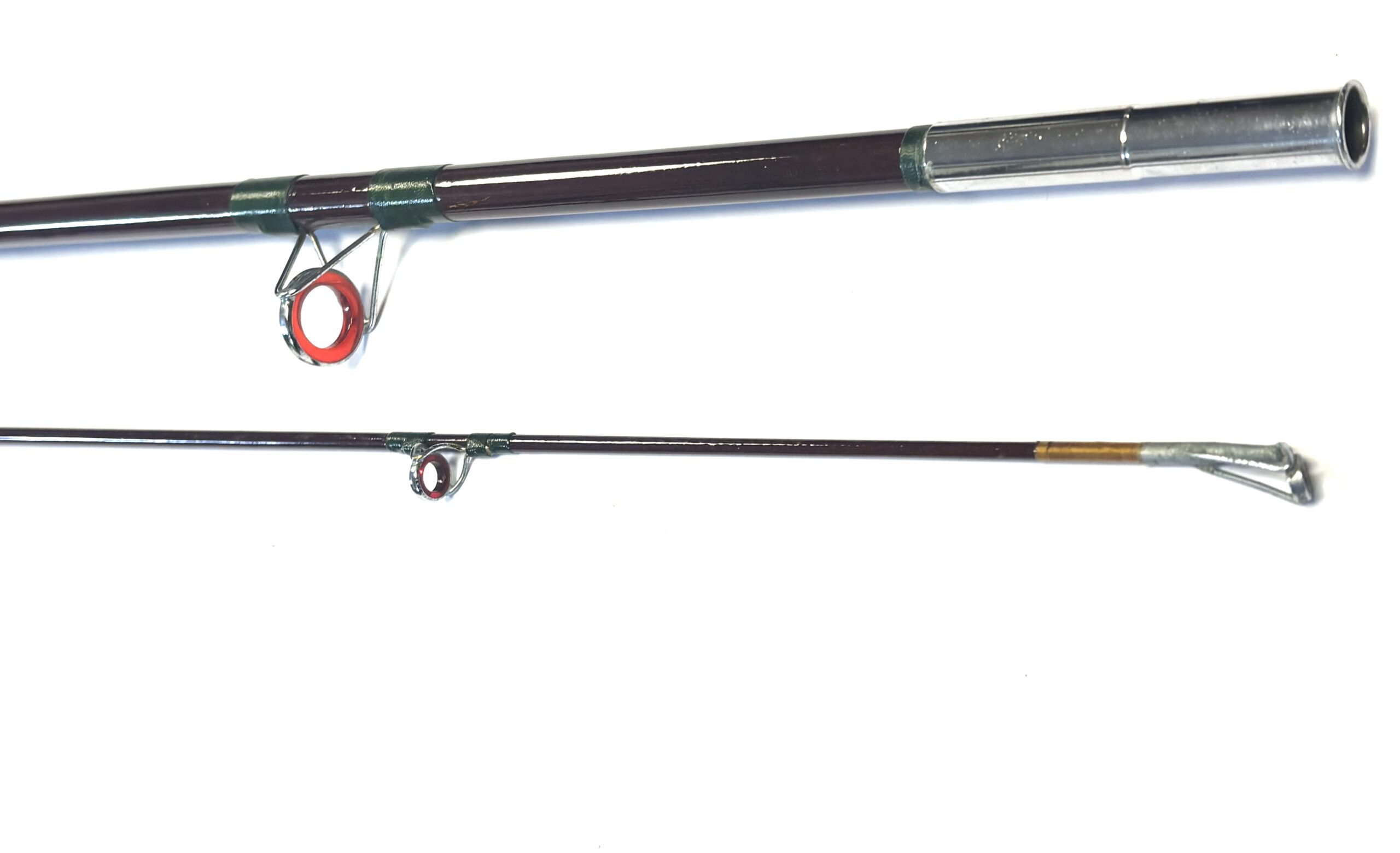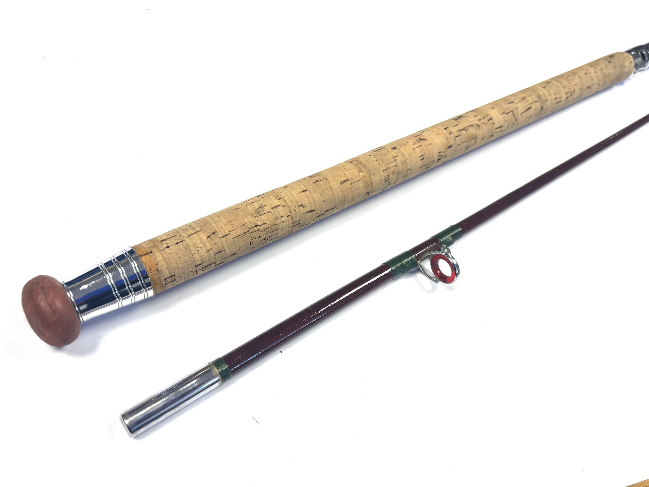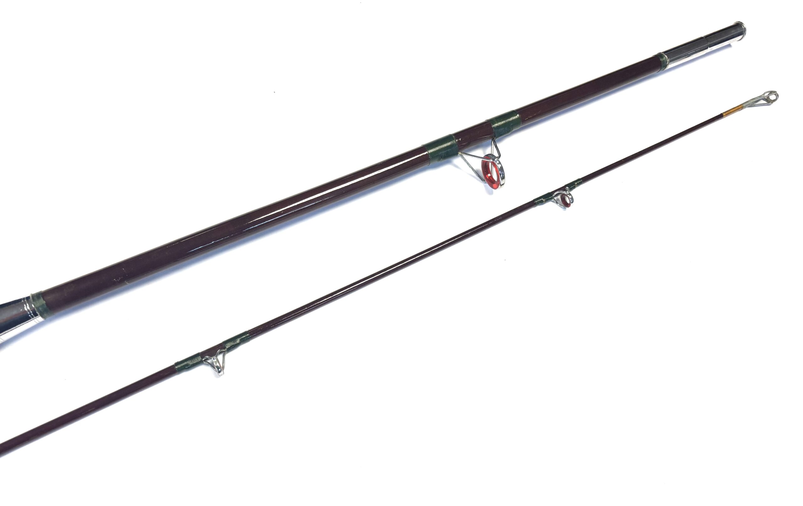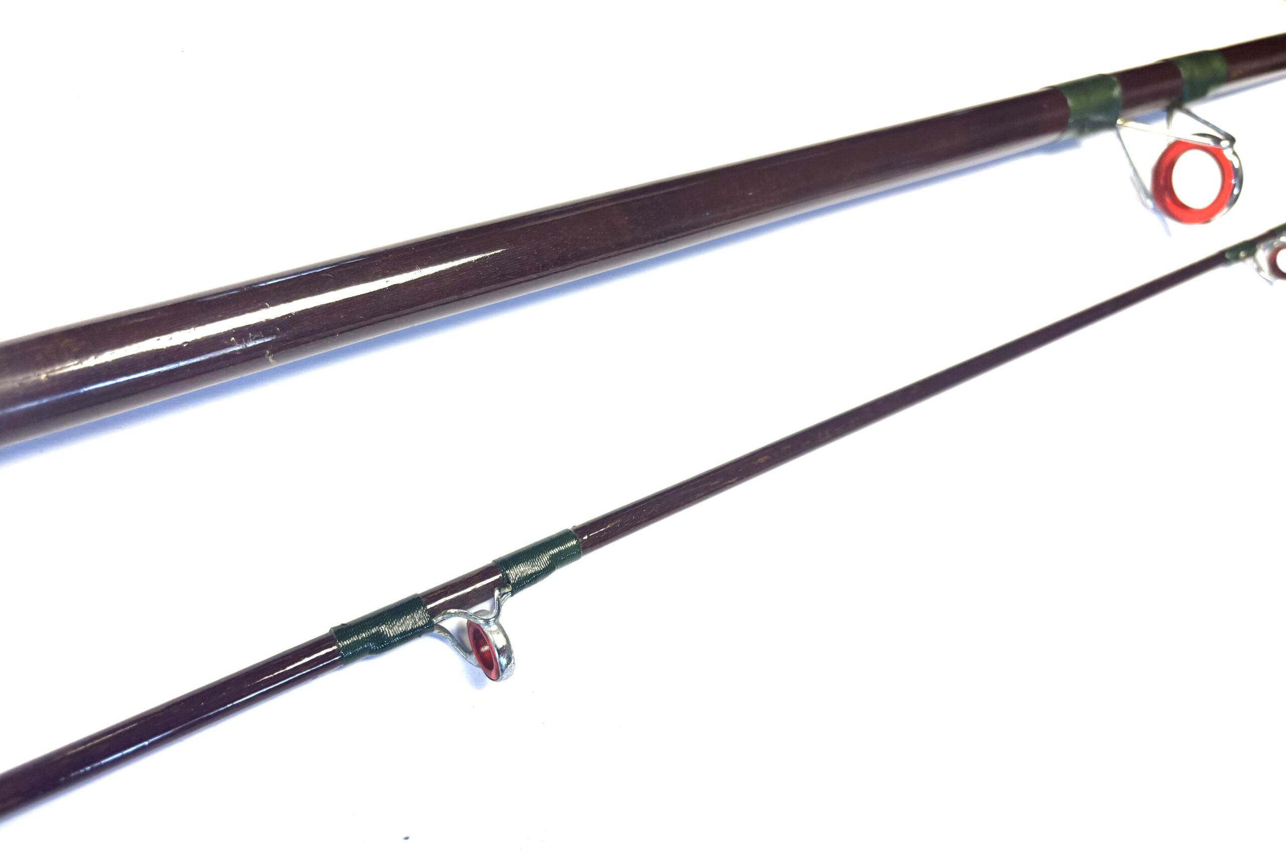 TT Opinion: A good example of a two-piece unidentified boat rod with lined guides, dark green wraps, smooth cork handle and polished alloy screw-in reel fittings. Supplied in beige bag.